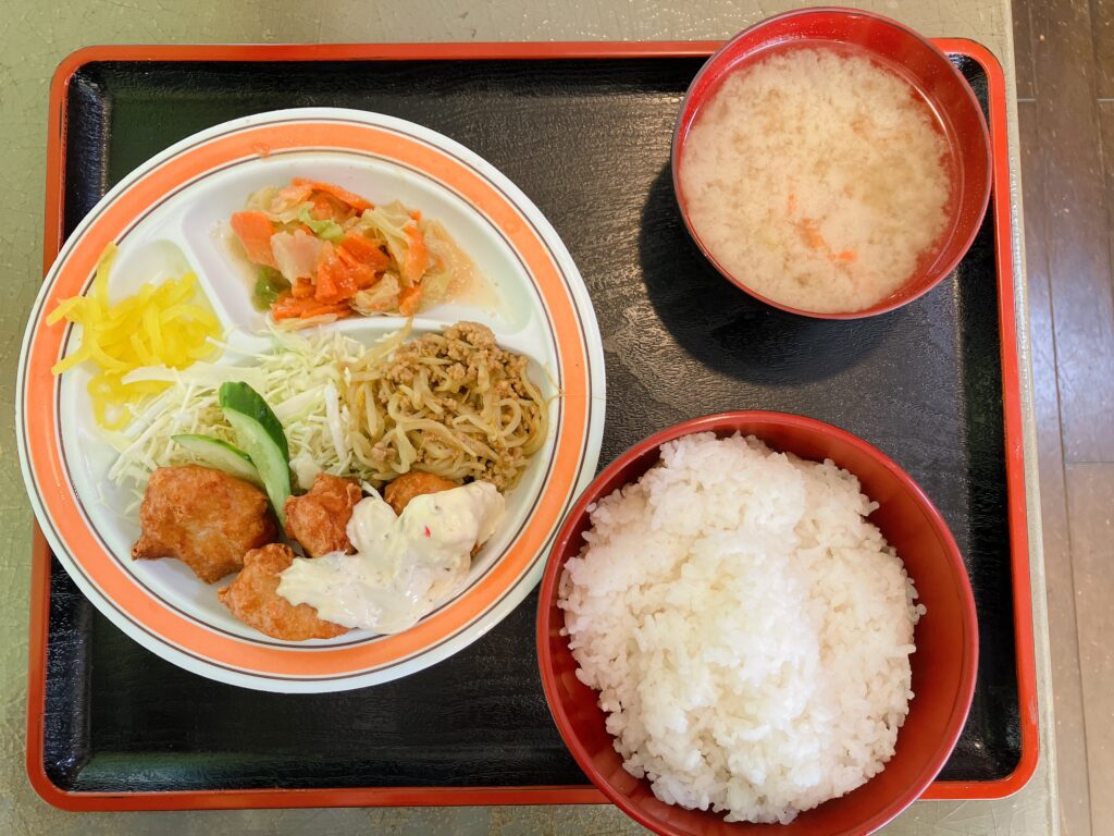 カレーの時もなんですが、ご飯の量はこれで普通盛りです。真上からだと分かりにくいですが、体感は大盛りの量です。そして、副菜が3種類くらいあるのが最高です。お昼ごはんに野菜が取れるって、最高ですよね。